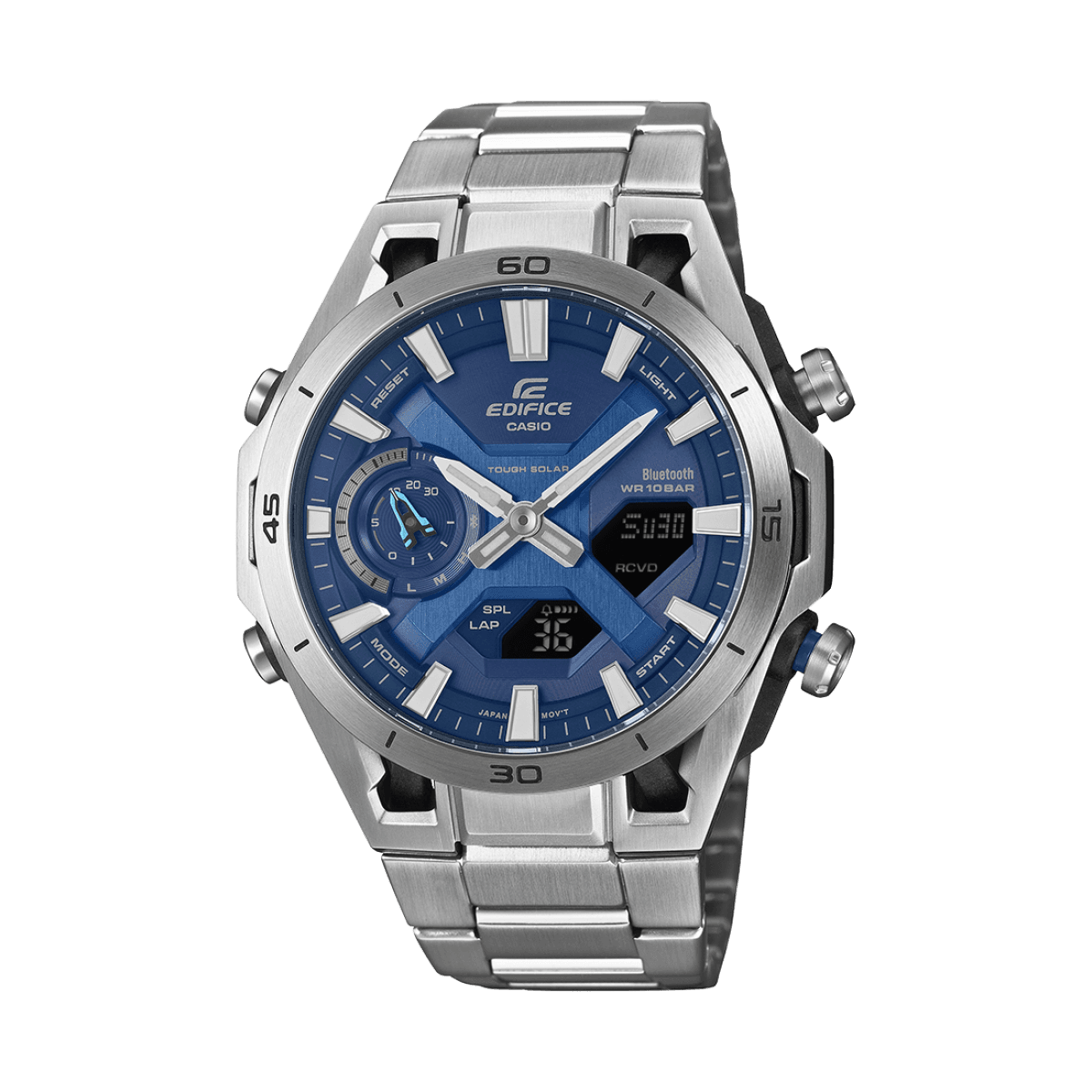 Super-Illuminator,Solarbetrieb,Neo-Display,Weltzeit Funktion,Stoppfunktion - 1/100 Sek. - 24 Std.,Timer - 1/1 Sek. - 1 Std.,5 Tagesalarme,mehrsprachige Wochentagsanzeige,Tastentöne ein/aus,Hand Moving Funktion,Automatischer Kalender mit Datum, Monat und Wochentag,12-/24-Stunden-Format,Edelstahl Armband,Ladekontrollanzeige